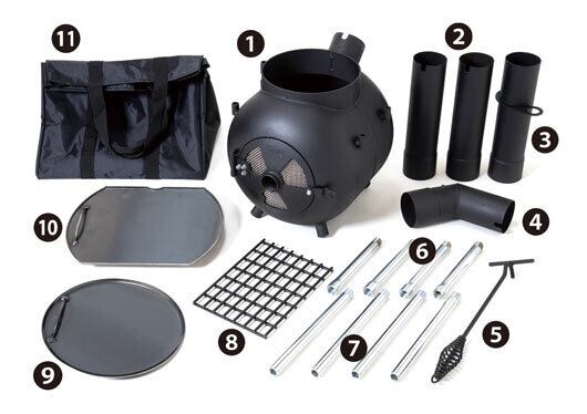 標準装備:1.本体 2.煙突 3.ダンパー付き煙突 4.エルボー煙突 5.リフティングツール 6.延長レッグ 7.レッグ 8.ファイヤーグレート 9.ラウンドウォームプレート 10.ウォームプレート 11.キャリーバッグ