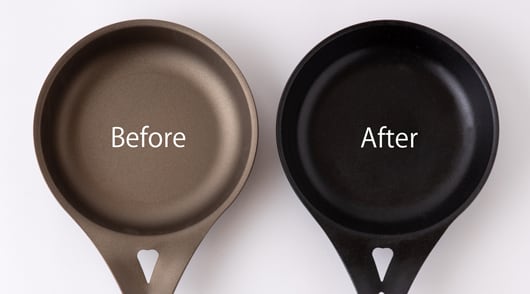 本格的な調理を始める準備としてフライパン表面に保護膜を作る「シーズニング」を行います。少量の油を薄く塗り広げ、黒くなるまで加熱し、火を止めて冷まします。この工程を3回程度、フライパン全体が黒光りして艶を帯びるまで行います。