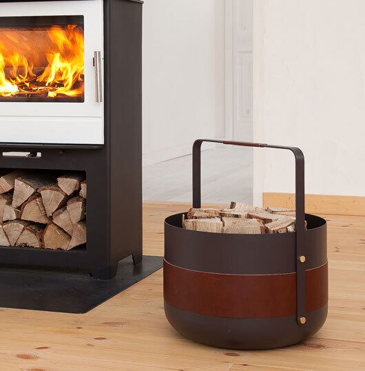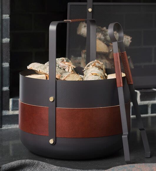 パウダーコーティングによるマットなボディの質感と、スウェーデンの名門革工房Tärnsjöで製造されたオーガニックレザーを組み合わせた高級感ある薪入れです。