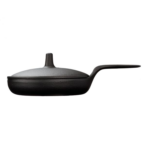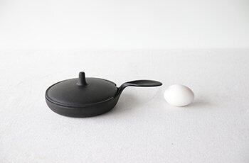 鉄の工芸家「小笠原陸兆」がデザインした「陸兆蓋付ミニパン」。キュッとつまんだような持ち手と鉄蓋の大きなつまみが特徴的で、テーブルウェアとしても人気の高い鉄器です。鉄蓋があることで、一人分の目玉焼きや餃子など「焼く」→「蒸す」料理を愉しめます。扱いやすい小ぶりのフライパンなので、子どもと一緒にスキレット料理を愉しむのにもおすすめです。